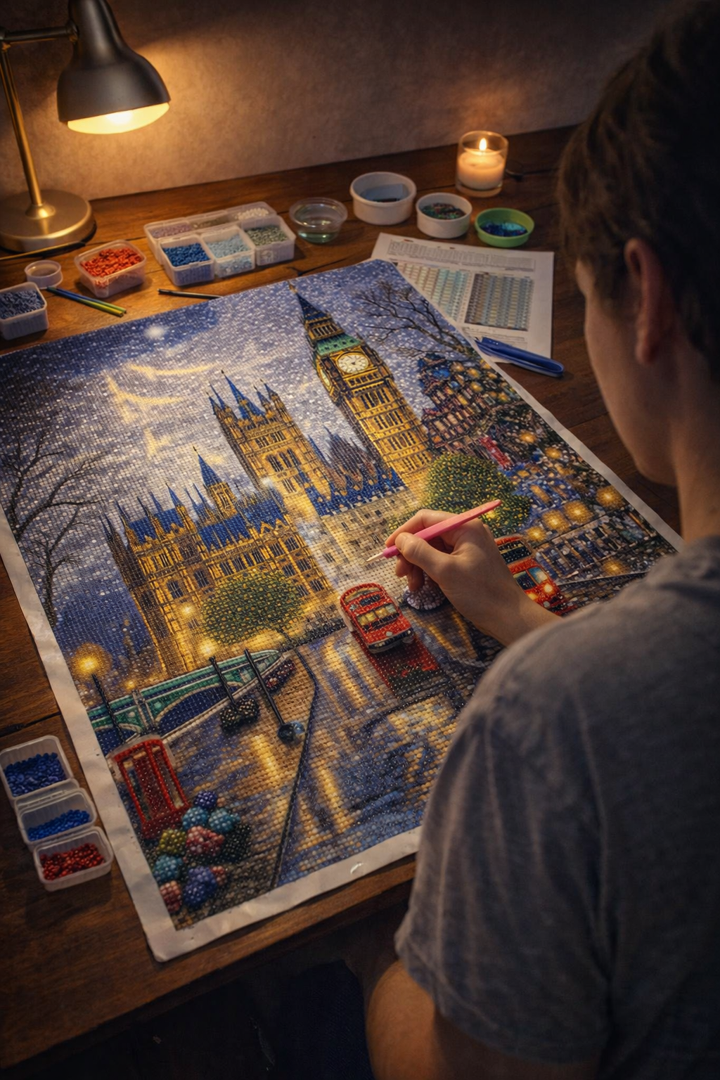 Boncuk sayısı resimden resme değişir; 40x50 cm'lik bir elmas boyama motifi yaklaşık 25.000 boncuk kullanır