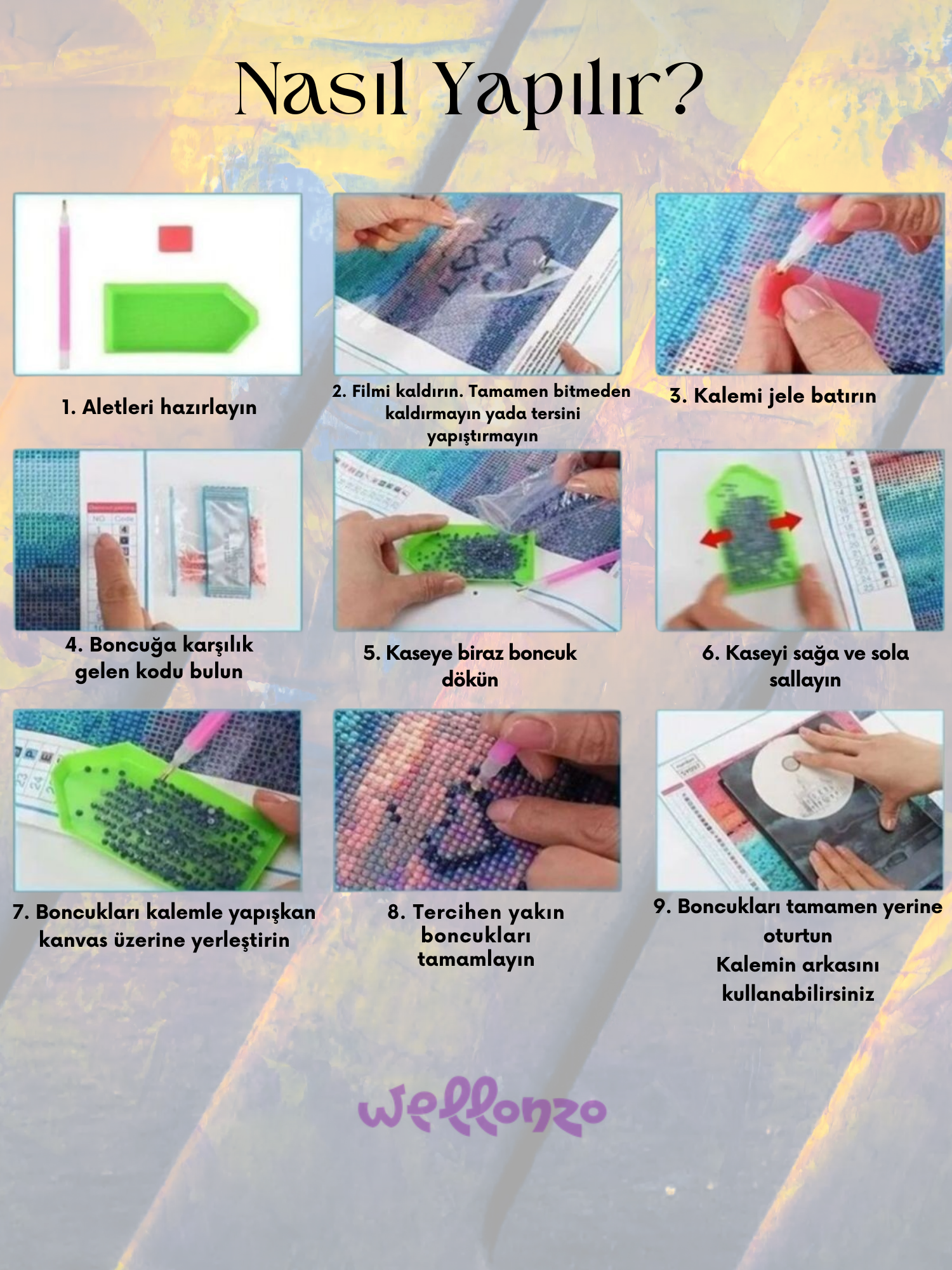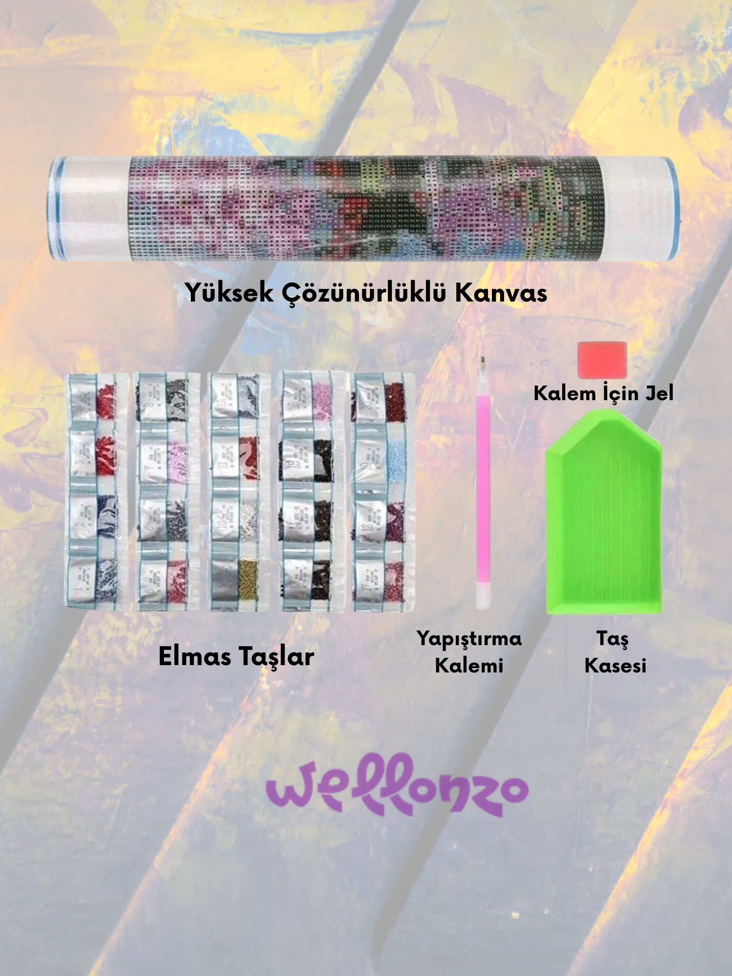 Her satın alımda eksiksiz elmas boyama setini gönderiyoruz. Tüm araç gereçleri, tuvali ve ihtiyacınız olan tüm elmasları alacaksınız. Ayrıca, %10 daha fazla elmas taş da gönderiyoruz, böylece bazılarını kaybetseniz bile her zaman yeterli taşınız olur!
