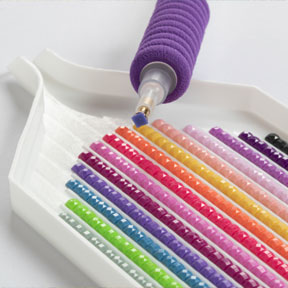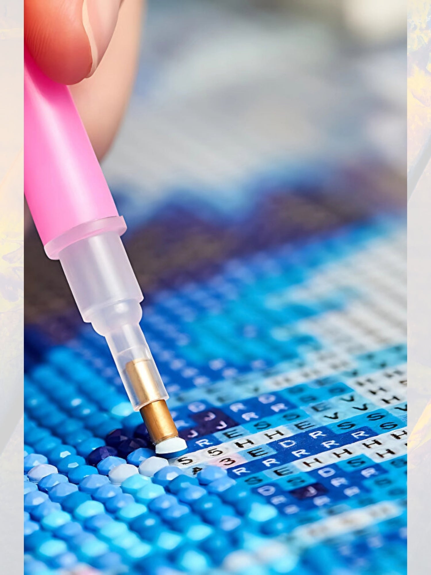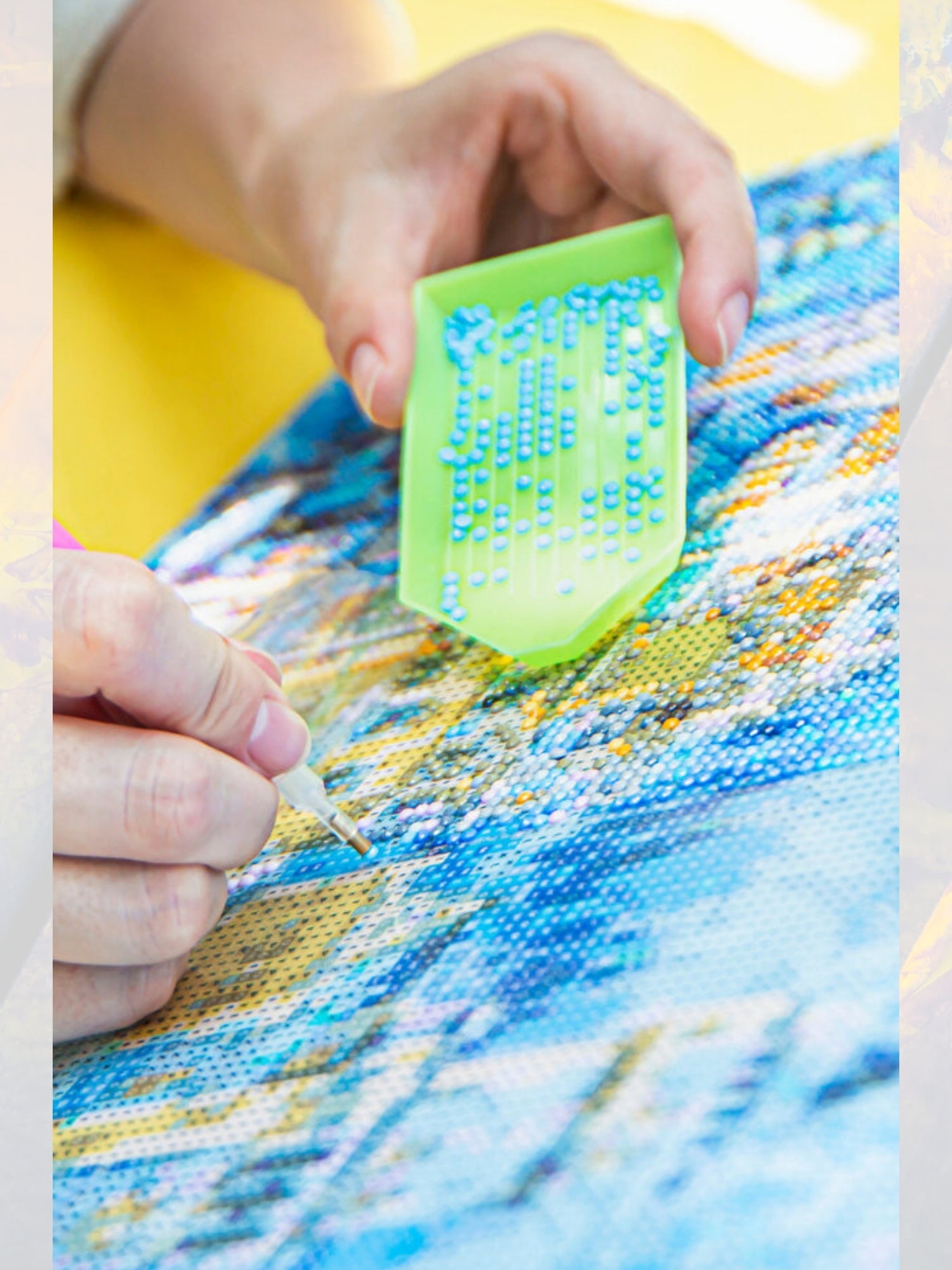 Uygulama aparatı ve biraz balmumu kullanarak ilk taşı alın ve tuval üzerindeki doğru konumuna dikkatlice yerleştirin. Ardından hafifçe bastırın.